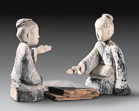 出土于西漢晚期48號墓的六博俑,包括一件棋盤、兩件俑。棋盤長29.2厘米,寬19.3厘米,呈長方形,黑色涂底,上面繪有白色“規(guī)矩紋”圖案,好似棋格;木俑高28.5厘米,為兩位跪坐相向?qū)牡睦夏昴行?。身著右衽長袍,梳圓髻,留胡須,全身以黑白為主色。