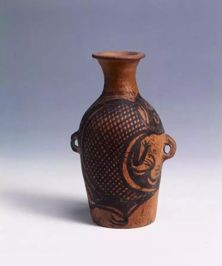鯢魚紋彩陶瓶,仰韶文化石嶺下類型,出土于武山縣馬力鎮(zhèn)傅家門村種谷臺(tái)遺址。國家一級(jí)甲等文物,通高18.7厘米。細(xì)泥紅陶,侈口、圓唇、束頸、溜肩、深斜腹、平底,兩側(cè)肩下各有一耳。紅陶黑彩,繪有一條胖大黑色鯢魚,鯢魚紋臉部為人面,有四足,足端各有四爪,尾部上翹,身上繪有網(wǎng)格狀鱗片,紋飾線條流利而靈動(dòng),變化豐富。這件彩陶瓶具有非常高的歷史和文化價(jià)值,其圖案具有原始龍的雛形,被學(xué)界認(rèn)為是中華龍的起源之一。