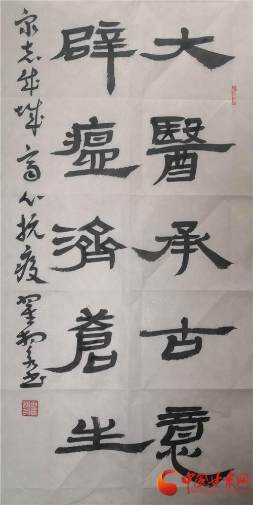 中國甘肅網(wǎng)2月12日訊(本網(wǎng)記者 張?zhí)m琴 張玉芳)2020年新春,面對突如其來的新冠肺炎疫情,全國人民正在以必勝的信心全力打贏這場沒有硝煙的戰(zhàn)爭。翰墨傳情,為抗疫助力。2月11日,由甘肅省文聯(lián)主辦,甘肅省文聯(lián)所屬文藝家協(xié)會、中國甘肅網(wǎng)承辦的甘肅文藝界戰(zhàn)“疫”主題作品展播活動正式啟動。我省12位書法大家揮毫潑墨,這些作品為所有奮戰(zhàn)在抗疫一線和防控疫情工作的平凡天使加油鼓勁,祈禱祝福,用文藝凝聚起抗擊疫情的強(qiáng)大精神力量,為我省防控疫情宣傳助力,受到了社會各界的贊譽(yù)。