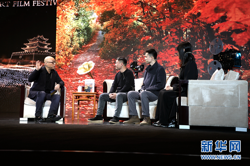 主持人與獲獎(jiǎng)影片的主創(chuàng)團(tuán)隊(duì)在現(xiàn)場(chǎng)交流分享。新華網(wǎng)(劉欣瑜 攝)