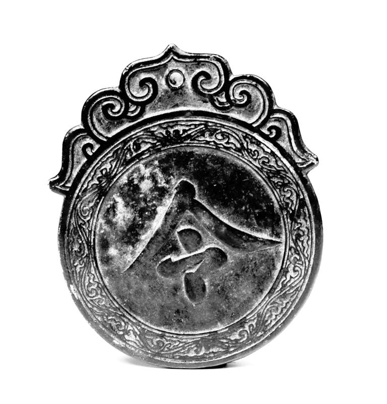 夜巡牌,高14厘米,寬11.5厘米,厚0.5厘米,紅銅制作。大體呈圓形,上面是狀如柿蒂形的鈕,鈕上雕刻有卷云紋,有一孔,用來(lái)穿繩。牌的正面為一楷書(shū)“令”字,字外三道弦紋,夾一圈卷云紋,背面為“肅字捌佰肆拾伍號(hào)”“永昌衛(wèi)指揮使司夜訓(xùn)牌”。