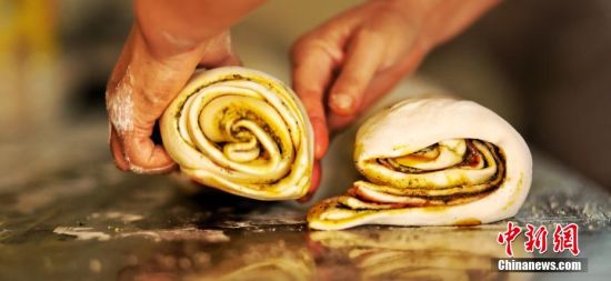 中秋節(jié)臨近,連日來蘭州市榆中縣家家戶戶開始制作傳統(tǒng)月餅,依照古老的技藝在大花饅頭中加入香豆、油酥、姜黃、紅曲等各種佐料,層層卷曲,色彩斑斕,狀似玫瑰。張文 攝