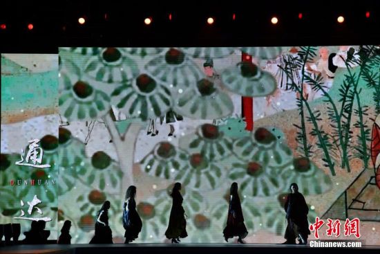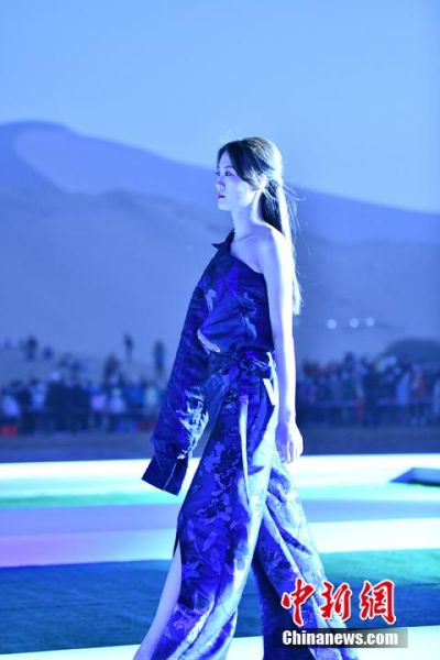 10月16日晚,敦煌國際時尚周在鳴沙山月牙泉景區(qū)開幕,張肇達(dá)·張凱惠攜手的作品在這里進(jìn)行了展演秀。圖為敦煌服裝秀展示。 殷春永 攝