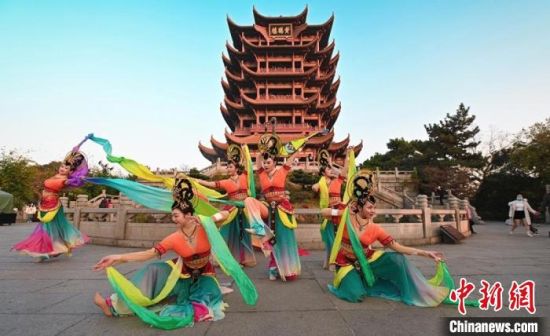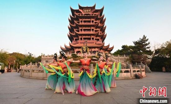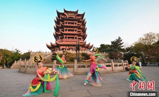11月27日,伴著幽幽古樂,“飛天仙子”在“江南三大名樓”之一的黃鶴樓前演繹敦煌舞。 甘肅省文化和旅游廳供圖