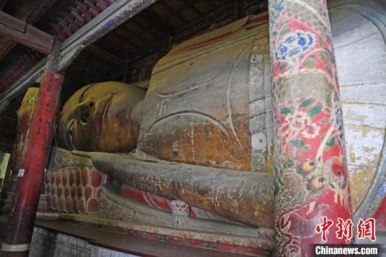 12月中旬,甘肅張掖大佛寺中重要文物的“數(shù)字孿生”打造工作已進(jìn)入新階段。圖為木胎泥塑臥佛。 楊艷敏 攝