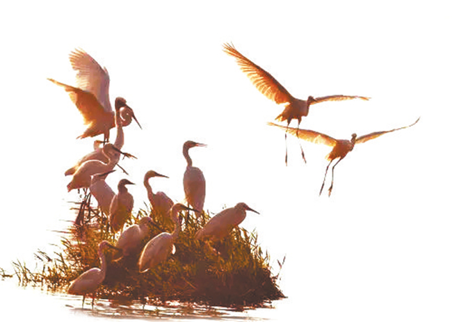 去年12月底,一位老師來西峰講學(xué),我陪先生到濕地海綿公園轉(zhuǎn)悠,剛剛步入人行道,發(fā)現(xiàn)遠(yuǎn)處湖水中央有七八只白鷺在棲息,朝陽斜射到湖面上,水波瀲滟,像細(xì)碎的金斑,白鷺安詳?shù)叵礈熘鹈幸恢话槅瓮戎绷⒅?,恰似依著一根筆直纖細(xì)的鐵絲,半張著翅膀,欲飛不飛的樣子,剩下的幾只白鷺在戲水,迷人極了。
