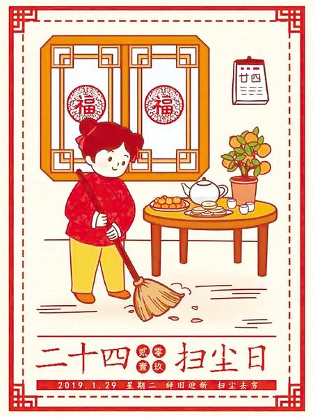 據(jù)《呂氏春秋》記載,這一風(fēng)俗源于堯舜時代。臘月二十四那天,隴上人家就陸續(xù)開始打掃起來,全家老少一起動手,清掃房屋積塵,石灰刷墻,新紙裱糊仰塵,擦洗窗欞,糊上新窗紙,貼窗花或貼“窗孔子”(微型花鳥畫與書法),擦拭箱柜上的銅什件、器皿污垢,打氈抖土,拆洗被褥。一番流汗勞碌,居室煥然一新,過年的心情也更加舒暢。