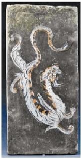 這件高臺縣博物館館藏的漢晉彩繪虎畫像磚,長42.5厘米,寬20厘米,厚6.5厘米,出土于駱駝城苦水口1號墓葬,屬國家二級文物。作為“四神”形象之一,多見于墓葬中磚砌門飾構件之上。