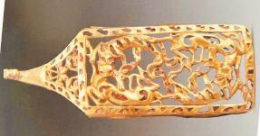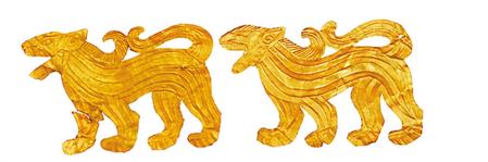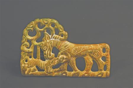 受草原文化影響,虎的造型更具藝術(shù)性,形式亦豐富多彩。甘肅省博物館藏的西周虎紋耳形銅鉞,整體似半環(huán),鑄猛虎紋,虎背為刃。尾下有短胡兩穿,尾、雙爪上鑄凹槽,虎首下彎,張口含銎,露牙睜目,領(lǐng)內(nèi)有一圓形穿孔。甘肅省文物考古研究所藏的戰(zhàn)國(guó)金帶鉤,鉤首為長(zhǎng)頸龍首狀,頸部為三棱狀,肩部三角形邊框內(nèi)鏤空雕鑄對(duì)稱(chēng)和狼形圖案。鉤身為長(zhǎng)方形,邊框內(nèi)鏤空雕刻一組正反相對(duì)稱(chēng)的虎噬大角羊圖案。張家川回族自治縣博物館藏的戰(zhàn)國(guó)晚期的虎形金飾片,虎尖耳上翹,大嘴張開(kāi),鬃毛卷曲上翹,尾前卷于背部與鬃毛相連,四足著地做行走狀,栩栩如生地展現(xiàn)了虎行走的動(dòng)感之態(tài)。甘肅省博物館藏的戰(zhàn)國(guó)虎噬羊紋金飾片,虎張口露齒,垂首蹲踞,虎口銜羊,前爪按住羊肩部,后爪抓住羊臀部,羊四肢跪地作掙扎狀,活靈活現(xiàn)地展現(xiàn)出猛虎捕食羊的瞬間動(dòng)態(tài),形象逼真。這些虎文物都是此次展覽中的亮點(diǎn)。