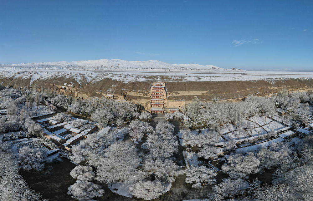 這是3月25日拍攝的敦煌莫高窟景區(qū)雪景(無人機照片)。新華社記者張智敏 攝