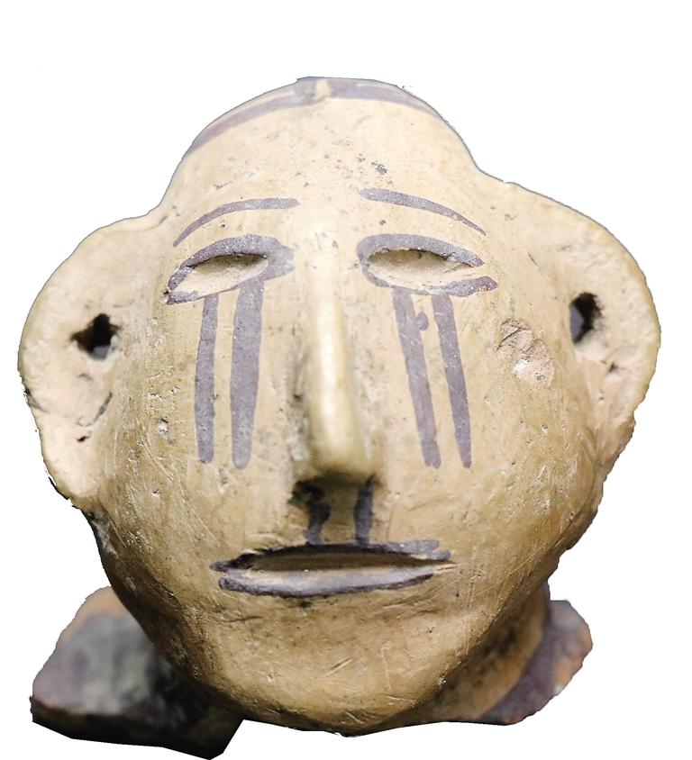 姓名:馬家窯文化馬廠類型人頭形彩陶器蓋 出生年代:距今約4350—4050年左右 住址:臨夏市博物館 體型:面部長(zhǎng)6.5厘米,寬6.5厘米,頭頂至后頸長(zhǎng)5.5厘米 自我描述: 我是國(guó)家一級(jí)文物。1992年,博物館工作人員從臨夏市王坪村村民手中收購(gòu)了我。我是由泥質(zhì)紅陶捏塑而成,我的表面略磨光,施黑彩,窄額長(zhǎng)臉,橢圓形眼,繪有眉毛,眼窩深陷,高鼻有鼻孔,雙耳較長(zhǎng)、呈半圓形,雙耳有小孔,大嘴微張,發(fā)式為直發(fā)、中分。頭發(fā)、眼輪廓線、嘴輪廓線均為黑彩繪就。特別值得一提的是,在我的雙眼下方臉頰上的雙直線條,仿佛是奪眶而出的眼淚。