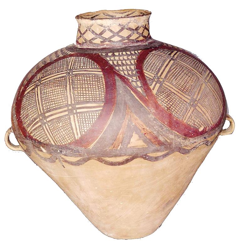 姓名:馬家窯文化半山類型四大圓圈雙耳彩陶罐 出生年代:距今約4650—4350年左右 住址:永靖縣博物館 體型:高46.6厘米,口徑15.6厘米,底徑12.2厘米 自我描述: 我是半山類型中的精品,屬于國(guó)家一級(jí)文物。泥質(zhì)紅陶,口沿微侈,直粗頸,闊肩,鼓腹,平底,腹有對(duì)稱雙耳,施黑紅彩,內(nèi)口飾水波紋六組,外口飾網(wǎng)紋,肩腹飾四大圓圈旋渦紋,間飾弧線鋸齒紋,腹中部飾寬帶紋,水波紋各一條,器型個(gè)體較大,胎體光滑,紋飾精致,色彩鮮艷。