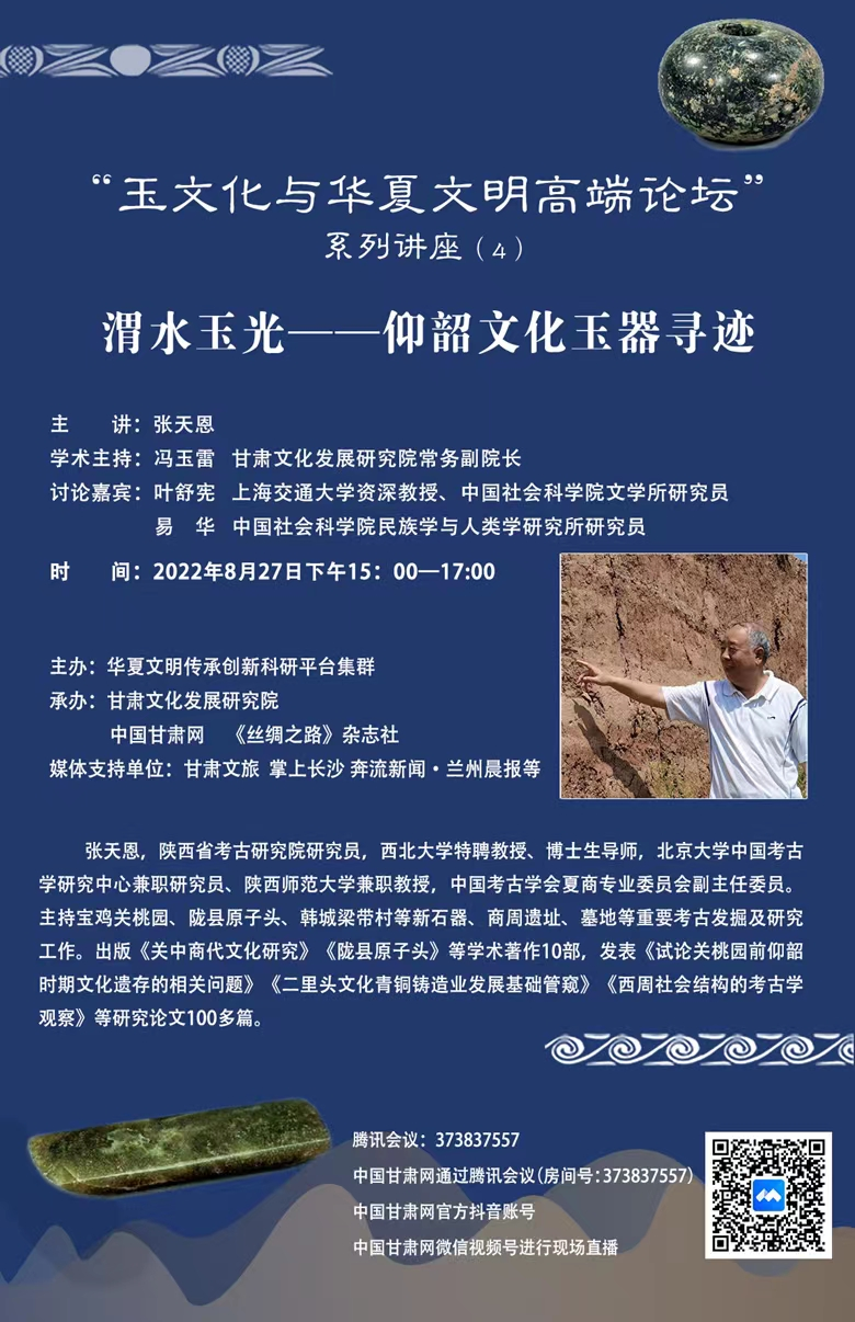 中國甘肅網8月28日訊  27日下午15:00—17:00,由西北師范大學華夏文明傳承創(chuàng)新科研平臺集群主辦,甘肅文化發(fā)展研究院、中國甘肅網、《絲綢之路》雜志社聯合承辦的“玉文化與華夏文明高端論壇”第四講《渭水玉光——仰韶文化玉器尋跡》成功舉辦。