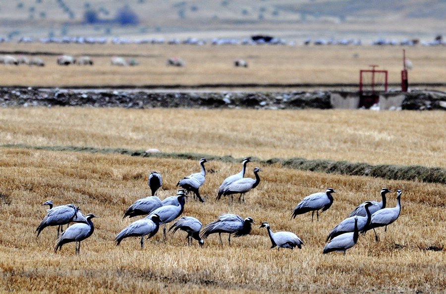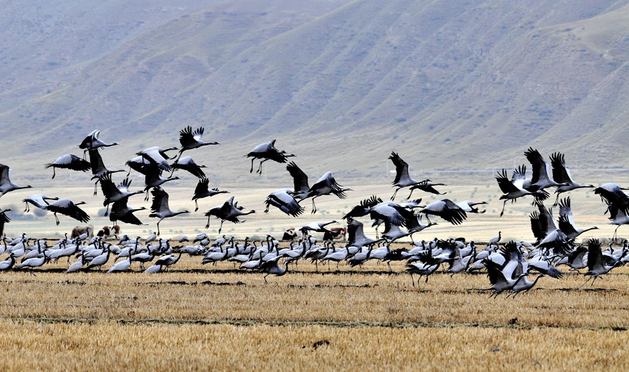 人民網蘭州10月10日電 (記者高翔)寒露至、候鳥遷,甘肅省肅南裕固族自治縣皇城鎮(zhèn)夏日塔拉草原迎來數千只蓑羽鶴,它們在濕地的水面上、草叢中或悠閑覓食、或蹁躚起舞,與色彩斑斕的草原構成了一幅和諧優(yōu)美的生態(tài)畫卷。