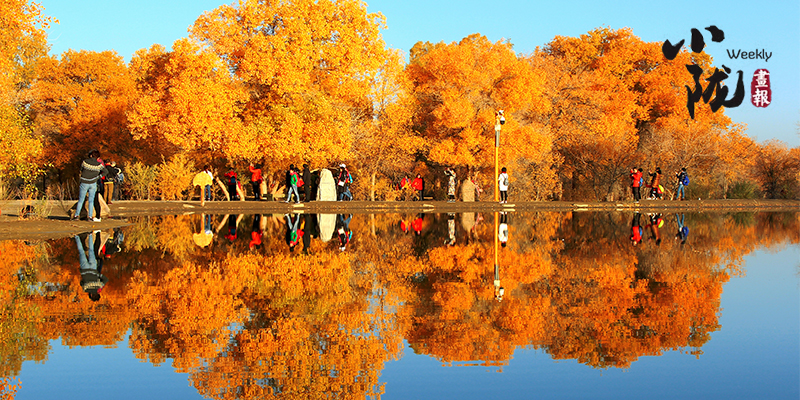 秋風起時,一樹金黃在湛藍的天空下連綿不絕,映著湖面,和流云飄逸的藍天一起,綻放成一幅壯麗的圖景。