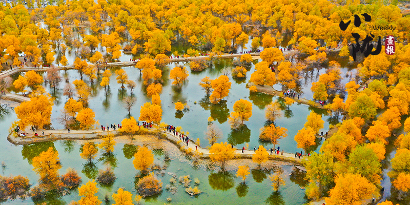 漫步林中,就仿佛進入神話中的仙境。茂密的胡楊干奇百怪,神態(tài)萬般。粗壯、滄桑的胡楊幾個人難以合抱,挺拔的有七八丈之高,怪異的似蒼龍騰越、虬蟠狂舞。每一棵高大的樹冠枝頭,間或又有淺綠、淡黃的葉片在閃現,錯落有致,色彩繽紛,滿眼的赤橙黃綠與盈盈秋水互相映襯,令人嘆為觀止?!?/p>