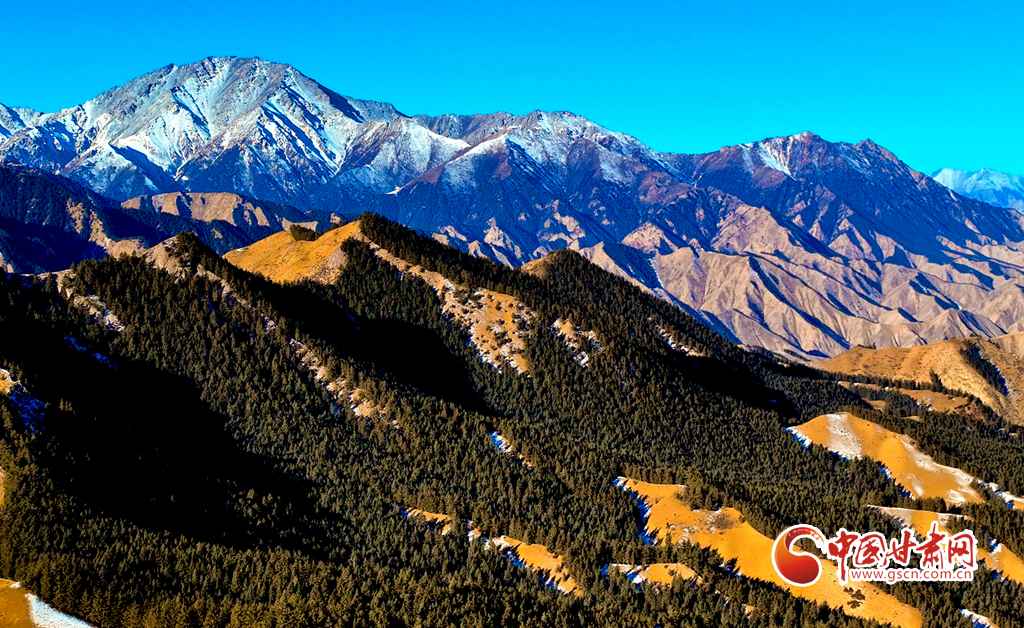 1月21日,雪后的祁連山國(guó)家公園甘肅省張掖段肅南片區(qū),遠(yuǎn)處的巍峨祁連山脈被皚皚白雪層層包裹,蒼松翠柏,浴雪草原,一派山舞銀蛇的壯美北國(guó)風(fēng)光。