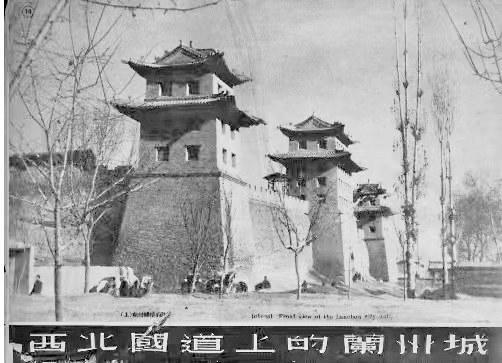 特別難得的是,他拍下了一張?zhí)m州城樓的照片,這是筆者見過的所有蘭州城樓中最壯觀的。照片上,中間的城門和兩個(gè)角樓并行排列,角樓前面是幾株西北地區(qū)常見的高聳挺拔的白楊樹,角樓底下是幾個(gè)正在等客人的黃包車夫。這座城樓是蘭州東郭城門迎恩門,俗稱東稍門(位于今東方紅廣場東口什字),中間有城門洞,南北兩側(cè)為角樓,無城門洞。