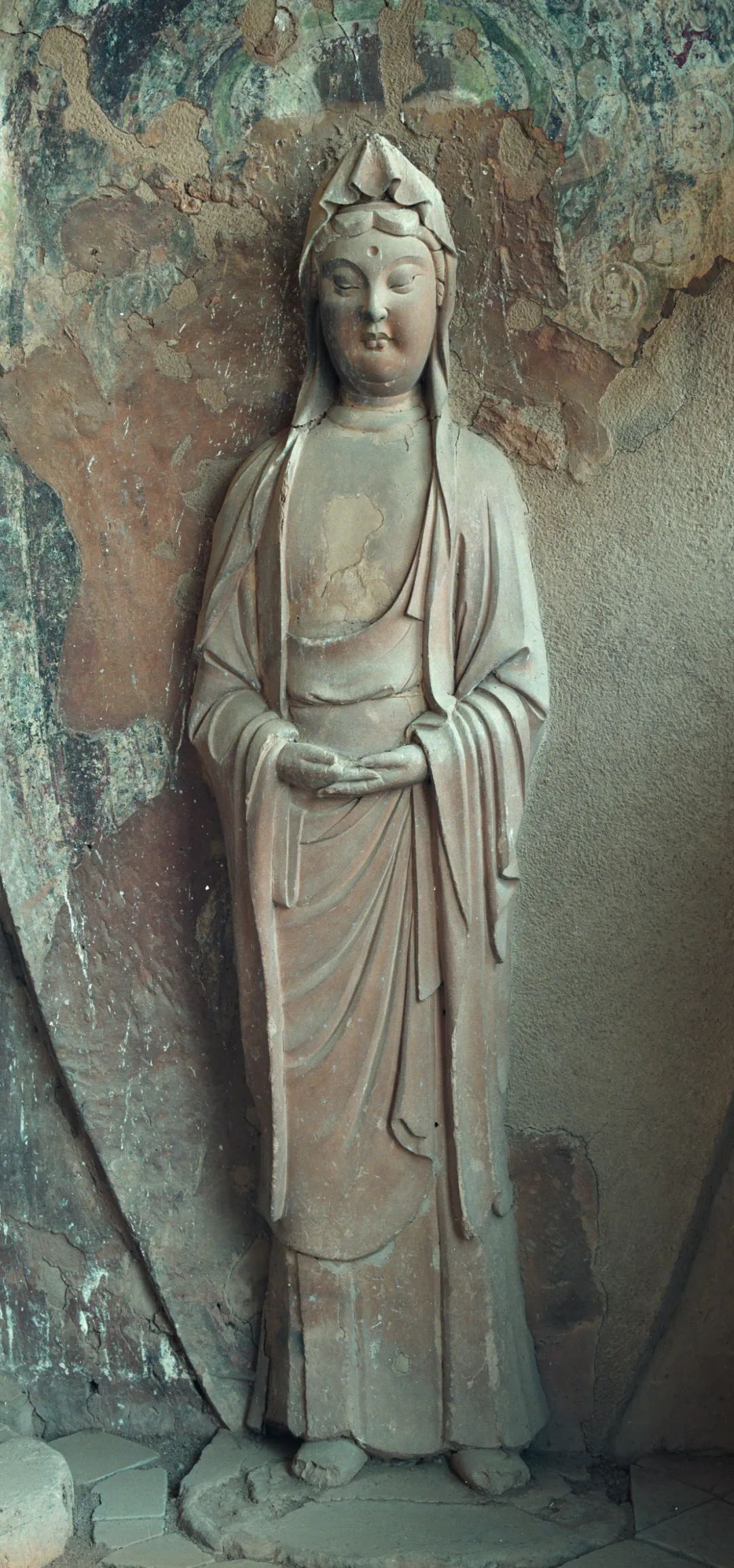 從題材上看,以單尊佛、菩薩、力士等為主,風(fēng)格上更具有寫實(shí)性。造像面相橢圓飽滿,斜眉吊目,懸鼻小口,表情森嚴(yán)、凝重,服飾簡潔、質(zhì)樸,寬博厚重,極富質(zhì)感。其中佛低平螺髻,前置肉髻珠,身穿垂領(lǐng)袈裟。菩薩束發(fā)高髻或戴風(fēng)帽,眉目慈祥,身材比例協(xié)調(diào)、準(zhǔn)確。力士表情生動傳神,體形孔武雄健,充滿陽剛之氣,給人以強(qiáng)烈的力量和威武感;這段時(shí)間造像前衰后盛也與當(dāng)時(shí)秦州所處環(huán)境有密切關(guān)系。