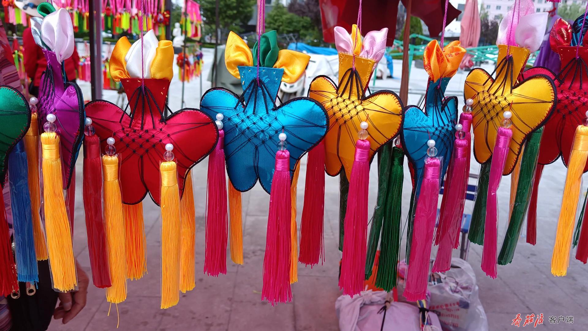 在眾多荷包中,馬尾荷包是荷包中的佼佼者,小巧精致,色彩鮮艷,既可以用來(lái)做裝飾品,也可作為禮物贈(zèng)送別人。馬尾荷包攤主大多是中老年婦女,也是馬尾荷包藝術(shù)的傳承者和守護(hù)者。馬彩玲就是其中之一,談起這種老手藝,老人充滿了喜悅。老人告訴我們,她十幾歲時(shí)就跟隨長(zhǎng)輩學(xué)習(xí)編荷包,如今已有四五十年的時(shí)間,比起賣荷包賺錢,更多的是她對(duì)馬尾荷包這種文化藝術(shù)的熱愛。馬彩玲說(shuō):“插楊柳、吃花饃饃,綁花線,戴荷包,一直是老傳統(tǒng),感覺非常的好,從小的時(shí)候就喜歡做這個(gè)東西,一直覺得丟不下,想把老傳統(tǒng)傳下去,每年都說(shuō)不做,但一到端午節(jié),就不由自己地開始做起來(lái)了。”