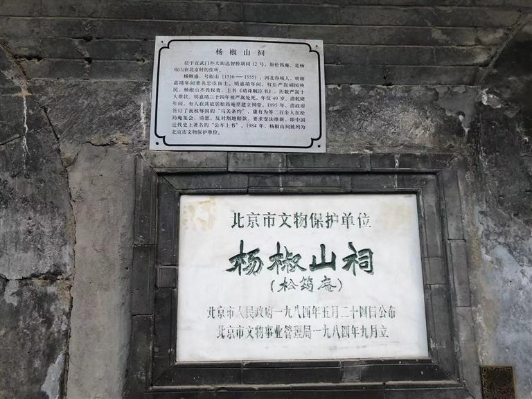 就是在這個(gè)胡同里,我看到一個(gè)歇山式屋頂?shù)姆课?,但已相?dāng)?shù)钠茢。蓓斏祥L(zhǎng)滿了凄凄荒草,門窗皆已破爛不堪。但是門旁的墻壁上卻鑲嵌著一塊匾,近前一看,上面寫(xiě)著“楊椒山祠”。喲,這就是楊椒山在北京的祠。