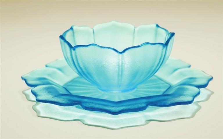 當(dāng)然,它的不凡更來(lái)自于它的創(chuàng)意源頭——甘肅省博物館展廳里那只造型華美、完整成套、顏色高貴的蓮花形玻璃托盞。