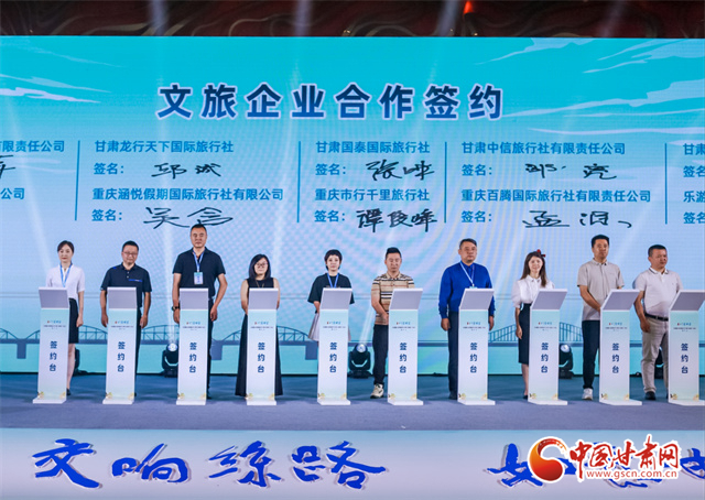 推介會上,蘭州、隴南兩地文旅部門分別作了當?shù)匚穆觅Y源主題推介。甘肅蘭鐵國際旅行社與重慶和平國際旅行社;甘肅蘭神國際旅行社與重慶西美國際旅行社;嘉峪關君和國際旅行社與重慶渝之旅國際旅行社等兩地的20家文旅企業(yè)(旅行社)代表分別簽訂了《甘渝客源互送合作協(xié)議》。