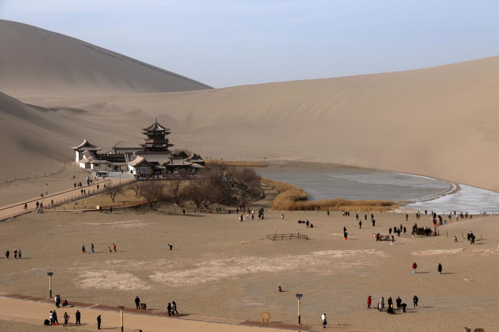 2024年2月10日,游客在甘肅省敦煌市鳴沙山月牙泉景區(qū)游覽。