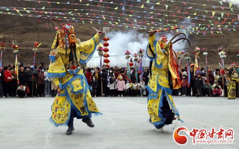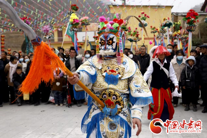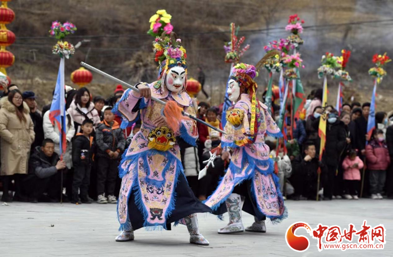 2024年2月19日,甘肅省隴南市武都區(qū)魚龍鎮(zhèn)柏家溝村,村民在表演當?shù)靥厣珓》N、國家級非物質文化遺產(chǎn)——高山戲。