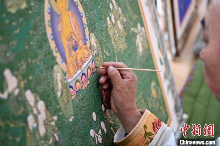 圖為交巴加布在個(gè)人工作室內(nèi)給唐卡上色。一幅精美的唐卡作品,需要耗費(fèi)畫師幾個(gè)月甚至幾年時(shí)間。從勾線到著色,每一步、每一筆都要屏息凝神。九美旦增 攝