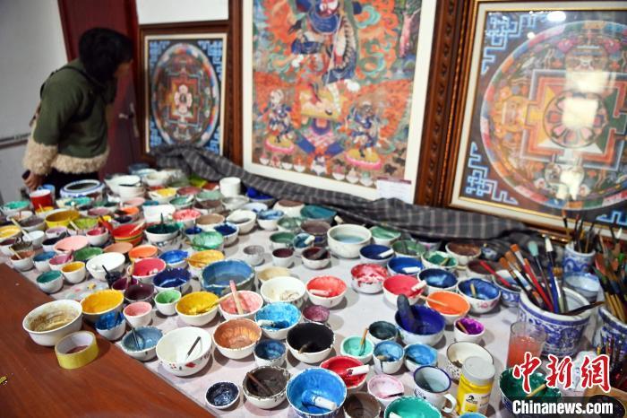 圖為唐卡小鎮(zhèn)一畫室內(nèi)擺出大大小小已完成的唐卡和各色顏料。唐卡具有鮮明的民族特點(diǎn)和獨(dú)特的藝術(shù)風(fēng)格,采用金、銀、珍珠、瑪瑙、珊瑚、松石、孔雀石、朱砂等珍貴的礦物寶石和藏紅花、大黃、藍(lán)靛等植物為顏料。九美旦增 攝