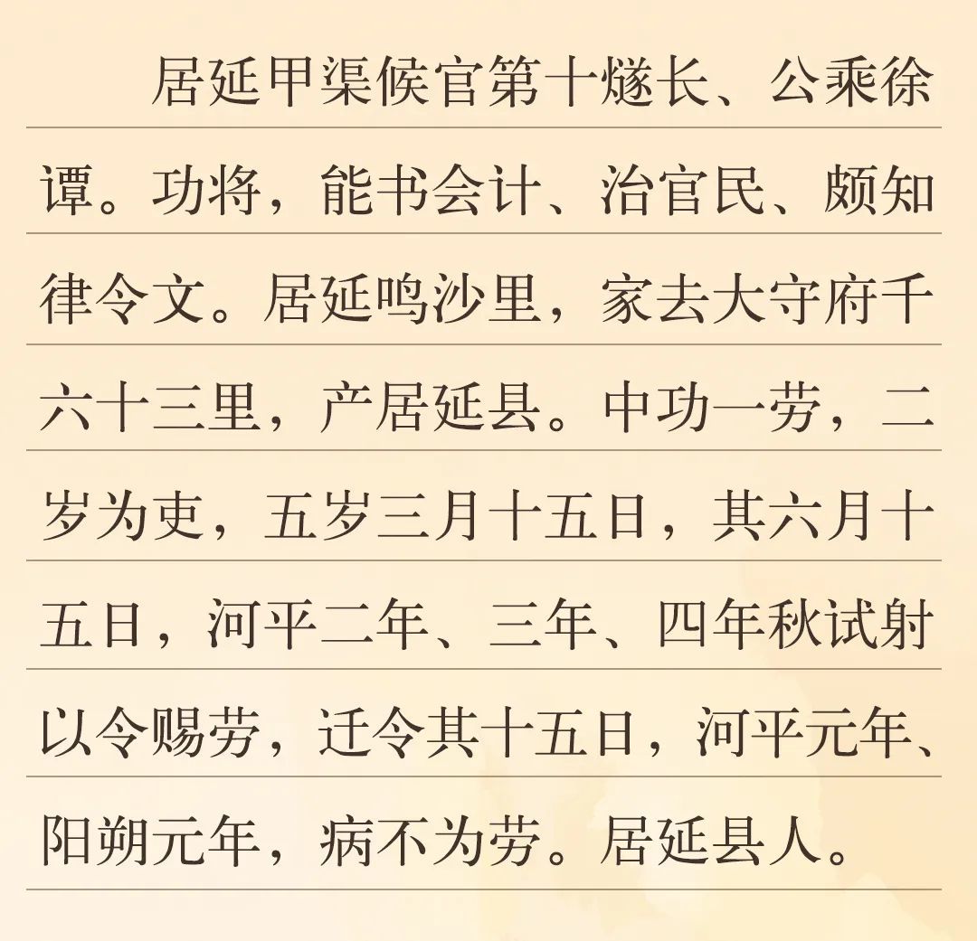 “中功一勞”中的“中功”指得到的功。功、勞、功勞、功績,是漢代計算政績的名稱與單位,戍卒與官員每日巡視、抵御外敵、參與秋射等,都能積攢“功”、“勞”。簡文中提到了“河平二年、三年、四年秋試射以令賜勞”,“秋試射”即漢代秋季比武活動之一的秋射。秋射成績優(yōu)秀可以賞賜勞績,漢代邊塞地區(qū)出土的簡牘中有大量以秋射獲勞的記錄,“功”與“勞”積攢到一定程度,便可升遷。當(dāng)這位官員所屬的候官發(fā)現(xiàn)空缺,便以功勞案為依據(jù),給出官員任免方案,呈報都尉府,以進(jìn)行官員的升遷調(diào)動。