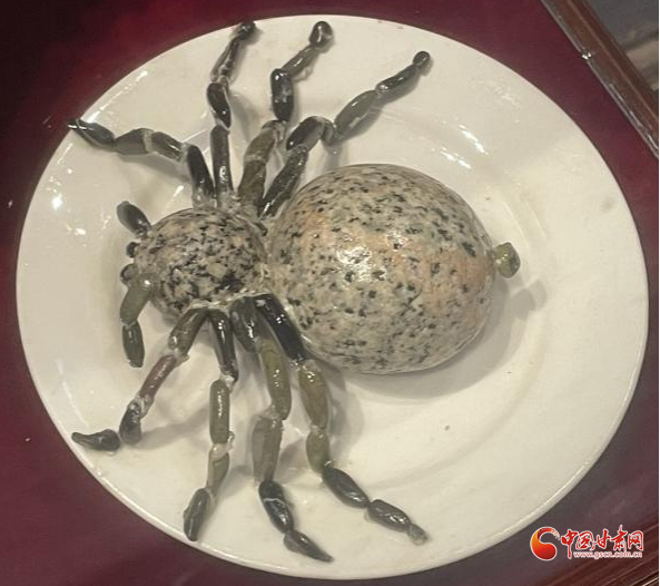 兩個花紋沒啥特點(diǎn)、一大一小的圓形石頭,再加上更細(xì)小的石粒,竟然被創(chuàng)作者粘連起來,打造成了一只“蜘蛛”,惟妙惟肖。