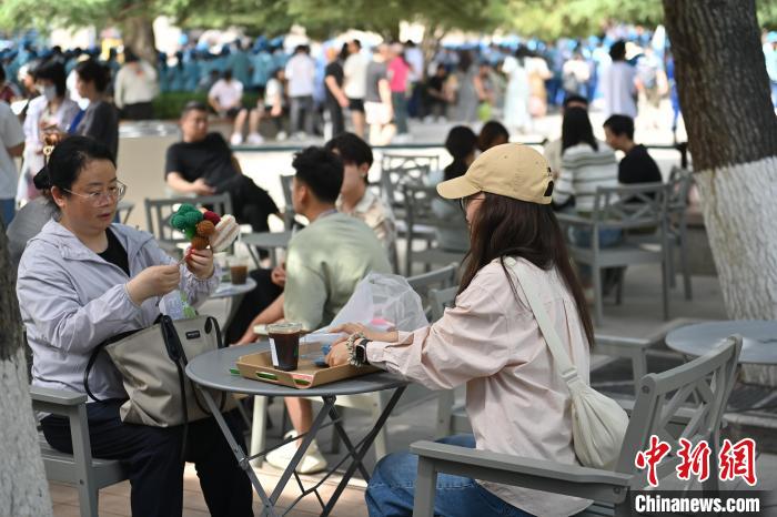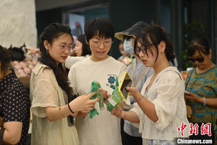 6月19日,甘肅省博物館藝術(shù)生活館在甘肅蘭州開館。該館是甘肅省博物館打造的一處復(fù)合型高價值文化空間,融合了咖啡、烘焙、展覽、藝術(shù)書店、文創(chuàng)銷售等多樣化業(yè)態(tài)。圖為游客相互交流挑選的綠馬玩偶掛件。中新社記者 李亞龍 攝