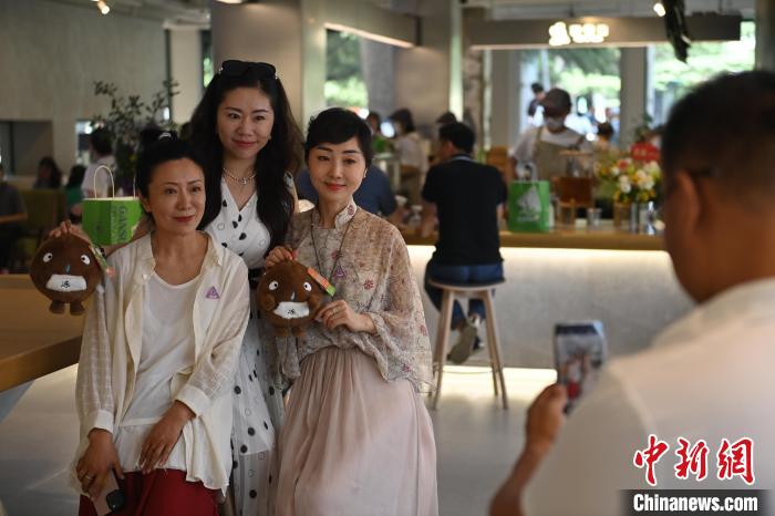6月19日,甘肅省博物館藝術(shù)生活館在甘肅蘭州開館。該館是甘肅省博物館打造的一處復(fù)合型高價值文化空間,融合了咖啡、烘焙、展覽、藝術(shù)書店、文創(chuàng)銷售等多樣化業(yè)態(tài)。圖為顧客與自己挑選的蘭州凍梨文創(chuàng)玩偶合影。中新社記者 李亞龍 攝