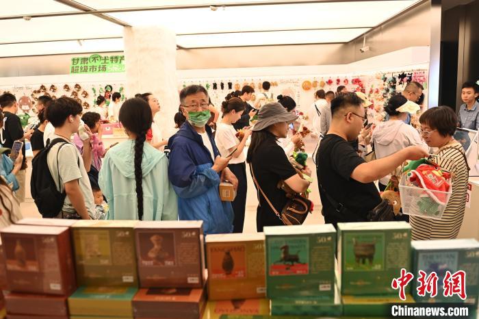 6月19日,甘肅省博物館藝術(shù)生活館在甘肅蘭州開館。該館是甘肅省博物館打造的一處復(fù)合型高價值文化空間,融合了咖啡、烘焙、展覽、藝術(shù)書店、文創(chuàng)銷售等多樣化業(yè)態(tài)。圖為游客挑選蘭州凍梨文創(chuàng)玩偶。中新社記者 李亞龍 攝