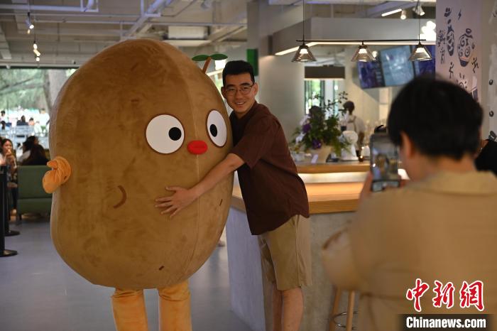 6月19日,甘肅省博物館藝術(shù)生活館在甘肅蘭州開館。該館是甘肅省博物館打造的一處復(fù)合型高價值文化空間,融合了咖啡、烘焙、展覽、藝術(shù)書店、文創(chuàng)銷售等多樣化業(yè)態(tài)。圖為顧客與蘭州凍梨文創(chuàng)真人玩偶合影。中新社記者 李亞龍 攝