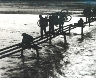 左圖為改造后的備戰(zhàn)橋,右圖為昔日涇河沿岸群眾搭建簡易木橋過河的畫面?! 。ㄡ轻紖^(qū)檔案館供圖)
