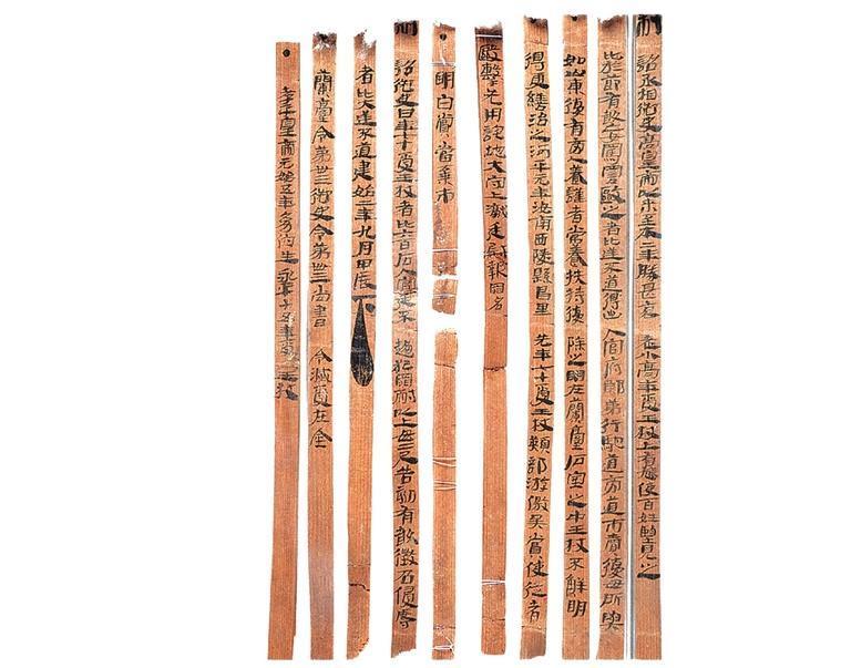 王杖簡(jiǎn),漢代,出土于武威市磨咀子漢墓。共計(jì)10枚,松木削制。兩道編繩,先書(shū)后編;墨書(shū)隸體,字跡清晰。每枚簡(jiǎn)容字多者37字,少者6字,共240字。其內(nèi)容記載了東漢永平十五年(72年)幼伯受王杖事,并錄建始二年(前31年)九月“年七十受王杖”的詔書(shū)與河平元年(前28年)毆擊王杖主當(dāng)棄市的令。