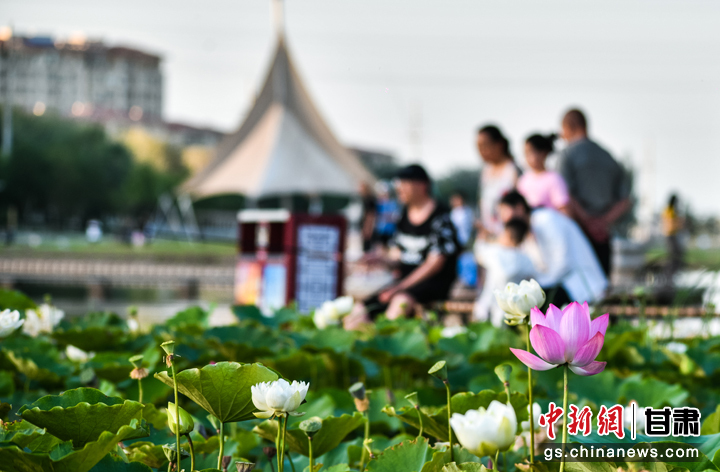 “接天蓮葉無窮碧,映日荷花別樣紅。”盛夏時(shí)節(jié),敦煌大漠綠洲持續(xù)高溫,鳴沙山下各種植物茁壯生長,黨河風(fēng)情線上的荷塘里荷花也競相綻放,紅的、白的,一朵朵,一簇簇,在微風(fēng)中搖曳,吸引眾多游人前來休閑避暑,賞荷納涼。王斌銀 攝