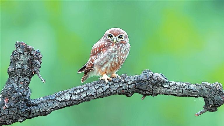 我近距離地看著這小小的、聰慧的鳥(niǎo)兒。它的上體是棕黃色的,散布著許多白點(diǎn),頭上的白點(diǎn)比身上的更加細(xì)密。貓頭鷹脖子的轉(zhuǎn)動(dòng)極限大約是270度,能水平轉(zhuǎn),也能上下轉(zhuǎn),這個(gè)“超能力”讓眼前的小家伙能更靈活機(jī)敏地打量我。它的眼周有一圈兒顯眼的白色,于喙的上方幾乎相連,變成兩道白色的眉毛,平添了幾分威武。