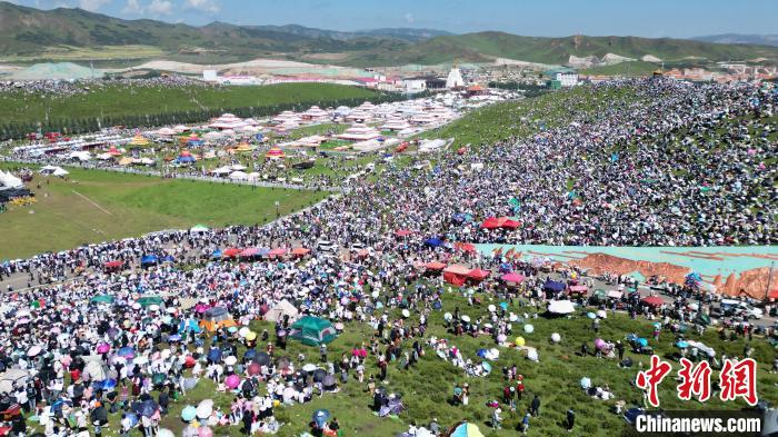 8月4日,民眾在當(dāng)周草原浪山聚會(huì)。當(dāng)日,第22屆九色甘南香巴拉旅游藝術(shù)節(jié)在甘肅省甘南藏族自治州當(dāng)周草原開(kāi)幕。人們身著節(jié)日盛裝載歌載舞、歡聚一堂,馬隊(duì)巡游、千人鍋莊舞等活動(dòng)精彩上演。九色甘南香巴拉旅游藝術(shù)節(jié)既是民眾浪山聚會(huì)的節(jié)日盛會(huì),也是展現(xiàn)發(fā)展成就、擴(kuò)大對(duì)外開(kāi)放的重要窗口,更是展示民俗文化、促進(jìn)廣泛交往交流交融的有效載體。(無(wú)人機(jī)照片)中新社記者 九美旦增 攝
