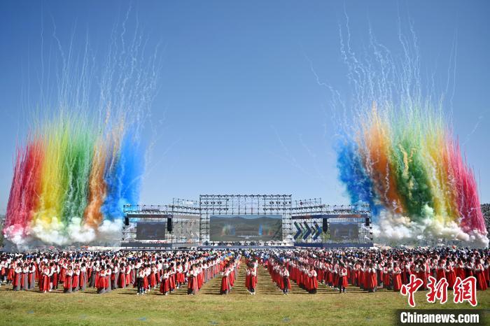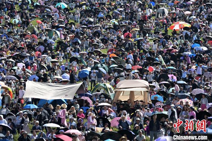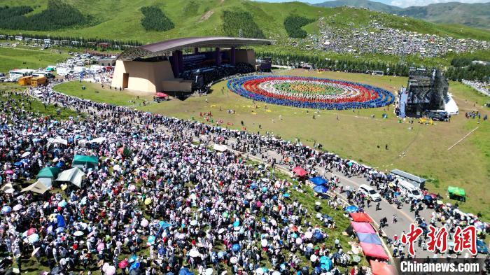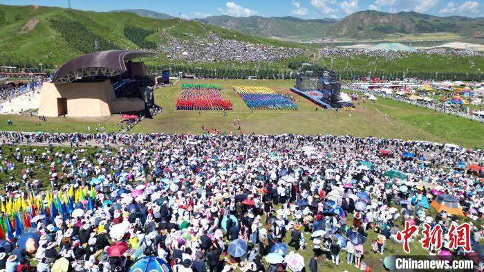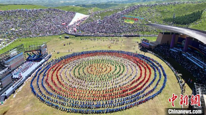 8月4日,第22屆九色甘南香巴拉旅游藝術(shù)節(jié)在甘肅省甘南藏族自治州當(dāng)周草原開(kāi)幕。人們身著節(jié)日盛裝載歌載舞、歡聚一堂,馬隊(duì)巡游、千人鍋莊舞等活動(dòng)精彩上演。九色甘南香巴拉旅游藝術(shù)節(jié)既是民眾浪山聚會(huì)的節(jié)日盛會(huì),也是展現(xiàn)發(fā)展成就、擴(kuò)大對(duì)外開(kāi)放的重要窗口,更是展示民俗文化、促進(jìn)廣泛交往交流交融的有效載體。圖為開(kāi)幕式現(xiàn)場(chǎng)。中新社記者 九美旦增 攝