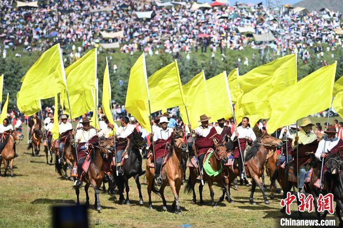 8月4日,藏族騎手在當(dāng)周草原上表演馬隊(duì)巡游。當(dāng)日,第22屆九色甘南香巴拉旅游藝術(shù)節(jié)在甘肅省甘南藏族自治州當(dāng)周草原開(kāi)幕。人們身著節(jié)日盛裝載歌載舞、歡聚一堂,馬隊(duì)巡游、千人鍋莊舞等活動(dòng)精彩上演。九色甘南香巴拉旅游藝術(shù)節(jié)既是民眾浪山聚會(huì)的節(jié)日盛會(huì),也是展現(xiàn)發(fā)展成就、擴(kuò)大對(duì)外開(kāi)放的重要窗口,更是展示民俗文化、促進(jìn)廣泛交往交流交融的有效載體。中新社記者 九美旦增 攝