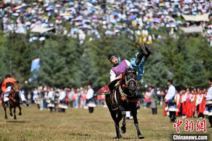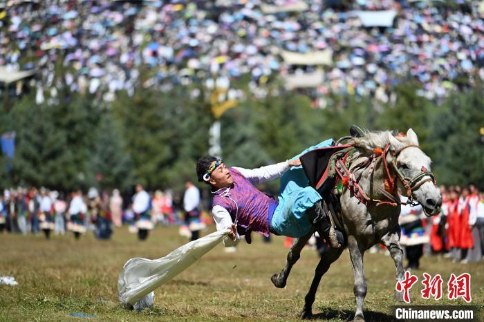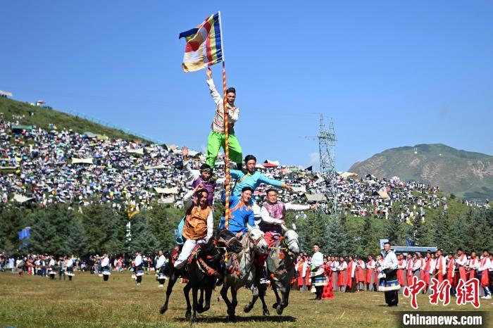 8月4日,藏族騎手在當(dāng)周草原上表演馬術(shù)。當(dāng)日,第22屆九色甘南香巴拉旅游藝術(shù)節(jié)在甘肅省甘南藏族自治州當(dāng)周草原開(kāi)幕。人們身著節(jié)日盛裝載歌載舞、歡聚一堂,馬隊(duì)巡游、千人鍋莊舞等活動(dòng)精彩上演。九色甘南香巴拉旅游藝術(shù)節(jié)既是民眾浪山聚會(huì)的節(jié)日盛會(huì),也是展現(xiàn)發(fā)展成就、擴(kuò)大對(duì)外開(kāi)放的重要窗口,更是展示民俗文化、促進(jìn)廣泛交往交流交融的有效載體。中新社記者 九美旦增 攝