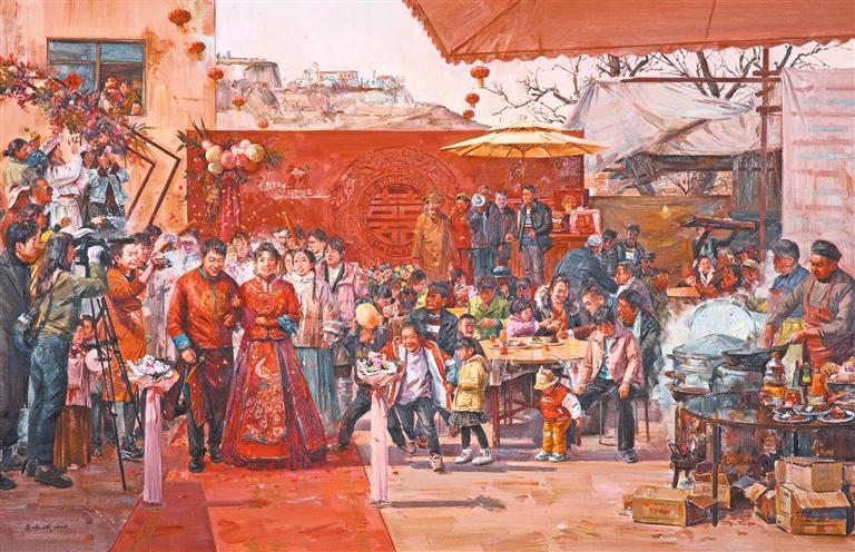 《成紀(jì)二月喜盈門(mén)》描繪了秦安一對(duì)新人舉辦婚禮的場(chǎng)景。身著傳統(tǒng)服飾的新人,在親朋好友祝福中朝觀眾走來(lái)。靜心觀察,會(huì)發(fā)現(xiàn)每個(gè)人都充滿(mǎn)鮮明的角色感,樸拙的外表、內(nèi)蘊(yùn)的情感、濃厚的民俗、歡樂(lè)的場(chǎng)景,共同交織成一方地域上的斑斕畫(huà)卷。