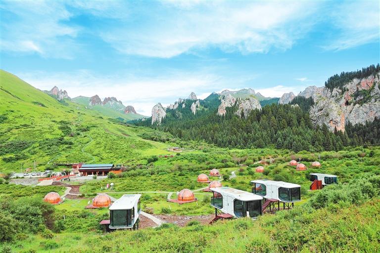 夏河縣的桑科草原上,游人在山間草場、樹林河邊支起一頂頂帳篷,白天品著飄香的奶茶,晚上躺在草地上仰望星空,很是愜意。