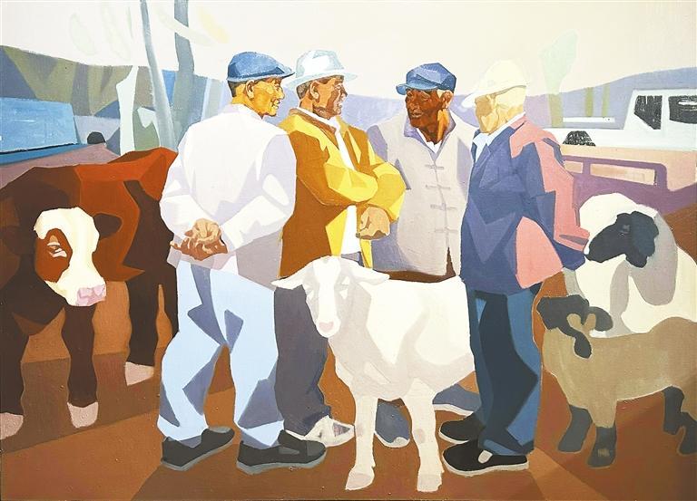 《和風(fēng)》系列作品取材于禮縣鹽官鎮(zhèn)騾馬市場(chǎng)逢集時(shí)交易的場(chǎng)景。幼時(shí),我經(jīng)常隨父親去鹽官騾馬市場(chǎng)趕集,對(duì)這個(gè)場(chǎng)景熟悉且親切。也正因?yàn)槿绱?,我?duì)這個(gè)題材有著難以割舍的情愫,總是忍不住想通過畫筆呈現(xiàn)這一記憶。