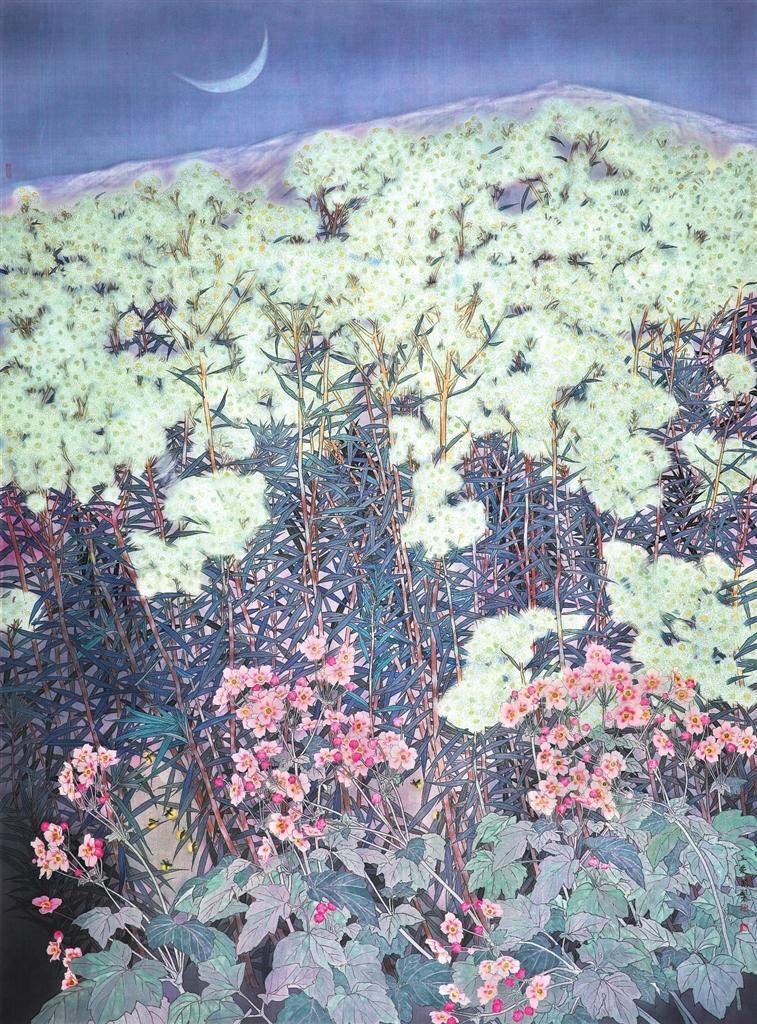 《白露》主要以白色野花香青為主體,野棉花為輔。拉長(zhǎng)香青的枝干,以增強(qiáng)畫面的氣勢(shì),繁茂的白花溫馨、浪漫,婀娜的野棉花花朵打破畫面的單調(diào),葉子又構(gòu)成小團(tuán)塊整體。夜幕下一輪新月,應(yīng)和著紫灰色的畫面主色調(diào),增強(qiáng)了這種美好氛圍。