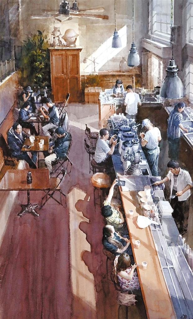 《網(wǎng)紅咖啡館的午后》用寫實(shí)方法展現(xiàn)了一個(gè)溫馨的生活場(chǎng)景。在構(gòu)圖上,以俯視的角度用大場(chǎng)景來做整體畫面的籌劃,在整體色調(diào)上以沉穩(wěn)厚重的暖色作為基調(diào),把光線穿插、引入到畫面中。在布局上,以陽(yáng)光照耀下的咖啡館吧臺(tái)為主要表現(xiàn)組群,分別刻畫、塑造了工作中的前臺(tái)人員、打卡拍照的女性顧客群;把暗部區(qū)域,幾組在咖啡桌邊交談、用餐、喝咖啡的顧客群作為第二層次,展現(xiàn)他們不同的神情和體態(tài);然后完善整體的空間感。在用筆上盡量以松動(dòng)的筆觸,又能展現(xiàn)細(xì)節(jié)的方式來塑造,利用水彩畫需要干、濕、松、緊相結(jié)合,多層次、多遍數(shù)進(jìn)行渲染的特性,盡可能達(dá)到預(yù)期效果。 (本版文圖由甘肅省美術(shù)家協(xié)會(huì)提供)
